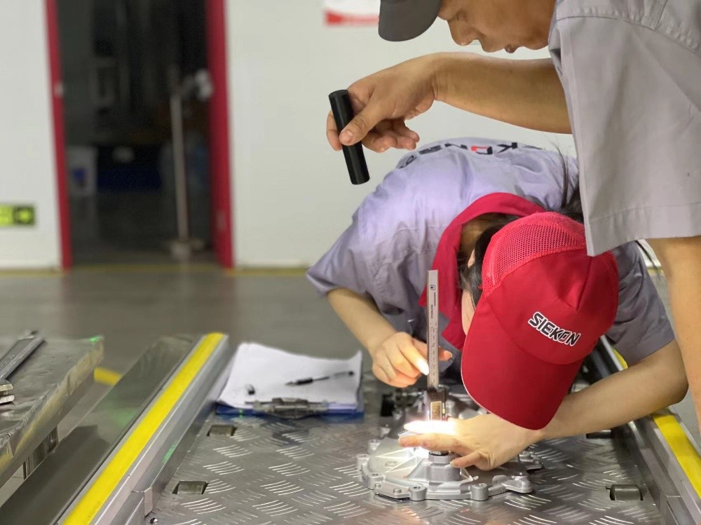 “報告,生產車間發現異常!”接到產線異常報告后,各部門和相關人員快速響應,爭分奪秒地匯聚到車間第一現場。大家圍繞異常點位,現場共同排查原因,經過生產、技術、質量、設備等多方人員的快速分析,終于發現了造成問題的原因:后殼差速器油封壓裝設備反力支撐未接觸到殼體,導致托盤下沉造成油封壓裝不到位。